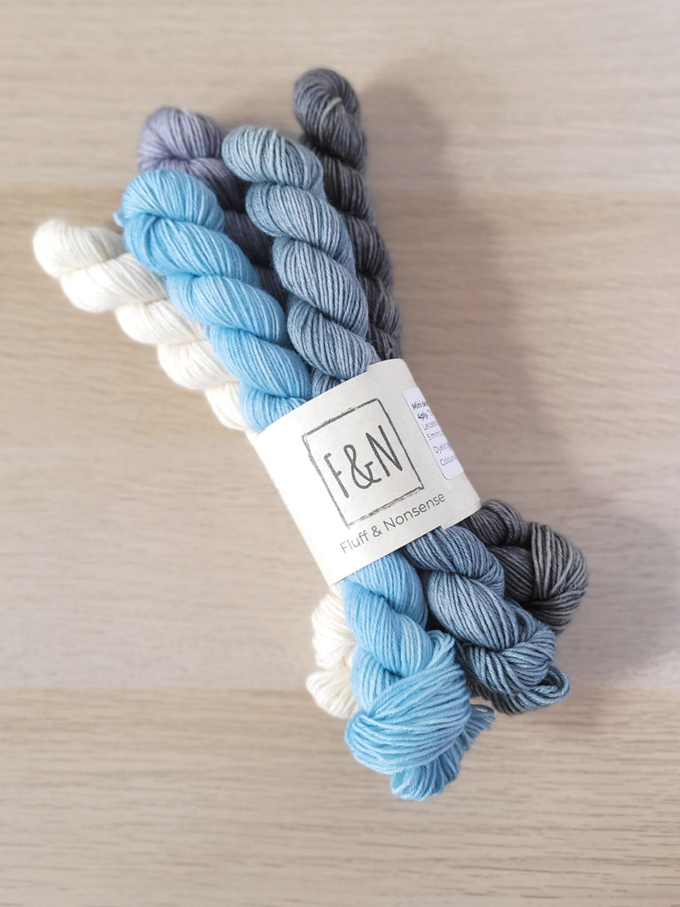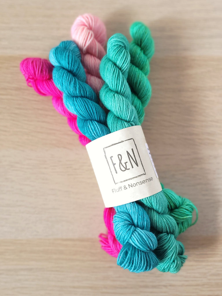 These mini skein sets that Tess from Fluff & Nonsense has created really are things of beauty. The semi-solid colours are gorgeous shades on their own, but as a fade they truly shine!